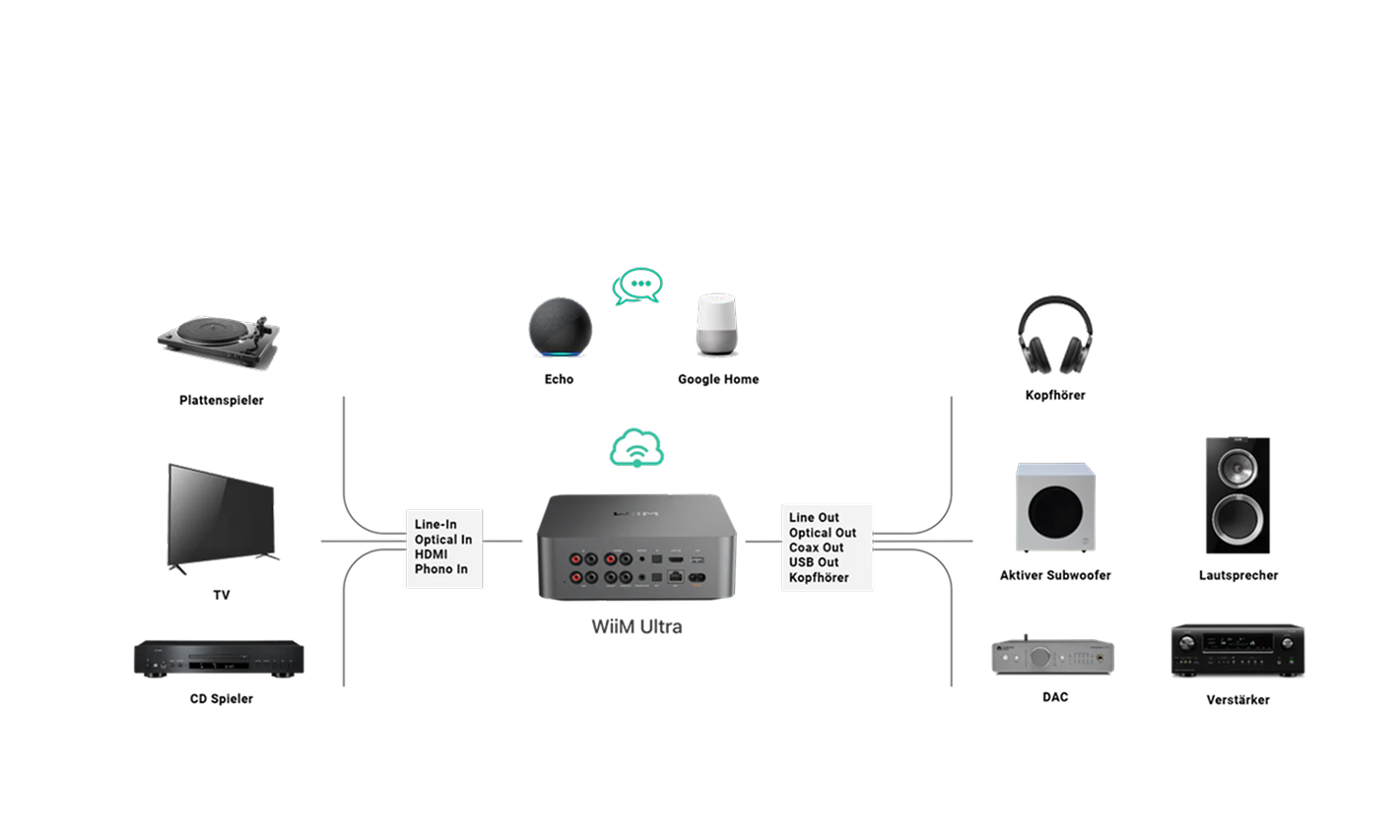 Dank seiner Vielseitigkeit kann der WiiM Ultra in verschiedene bestehende Setup-Konfigurationen integriert werden. Egal ob in einem traditionellen HiFi-Streaming-Setup oder als Teil eines modernen Smart-Home-Systems, der WiiM Ultra fügt sich nahtlos ein und erweitert die Audiooptionen eines jeden Haushalts.